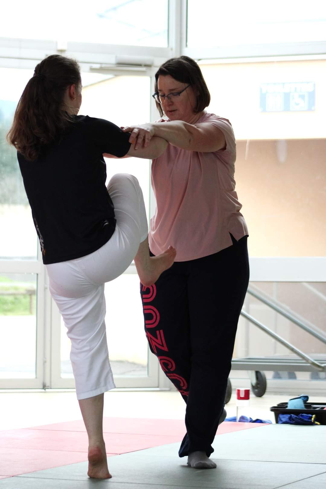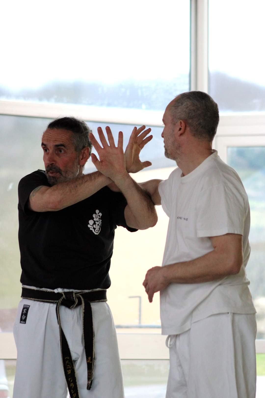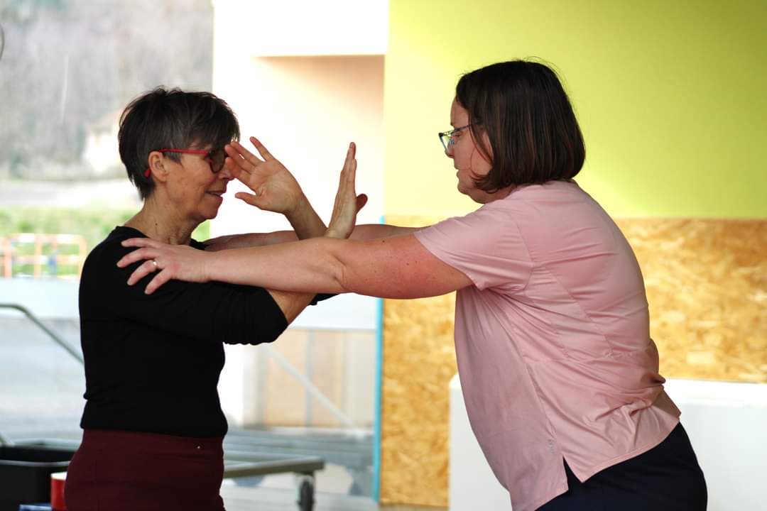 Les deux heures étaient centrées sur la self-défense : après l’échauffement, Franck et Romain ont enchaîné les mises en situation d’agressions possibles et les gestes de base pour s’en défendre.